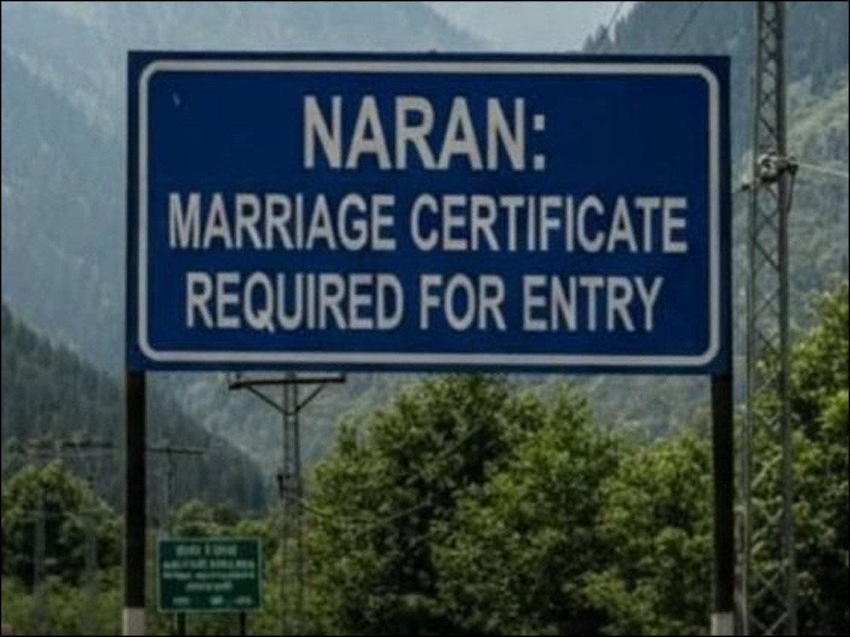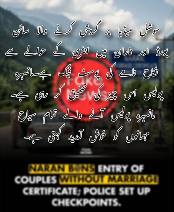 یہ خبر دیکھتے ہی دیکھتے ہزاروں صارفین تک پہنچی، فیس بک پر ایک پوسٹ میں مبینہ سائن بورڈ کی تصویر شیئر کی گئی جس پر لکھا تھا ’’ناران: داخلے کے لیے نکاح نامہ ضروری ہے‘‘۔