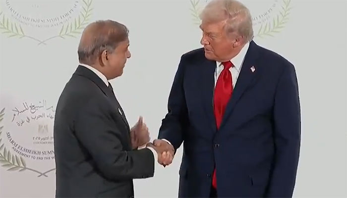 وزیر اعظم شہباز شریف اور امریکی صدر ڈونلڈ ٹرمپ کی مصر کے شہر شرم الشیخ میں ملاقات ہوئی ہے، صدر ٹرمپ نے شہباز شریف کے ساتھ گرمجوشی سے مصافحہ کیا۔
