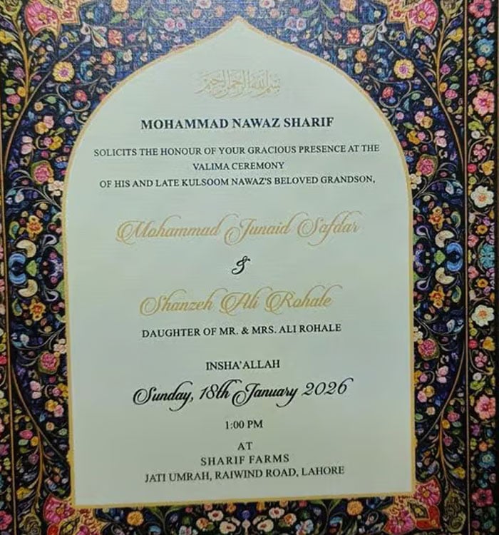 ویڈیو اور سوشل میڈیا پر گردش کرنے والے ولیمہ کے کارڈ کے مطابق تقریب 18 جنوری 2026 کو ہوگی، شریف خاندان کی جانب سے تقاریب کی تاریخ سے متعلق تصدیق یا تردید نہ ہوسکی۔