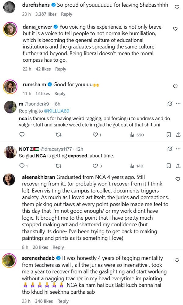 پاکستانی اداکاراؤں درافشاں سلیم اور دانیہ انور نے بھی عبدالرحمان عاصم کی ہمت کی تعریف کی اور کہا کہ ایسے مسائل پر بات کرنا ضروری ہے۔ دوسری جانب کئی صارفین نے دعویٰ کیا کہ بُلنگ کے باعث انہیں اپنی تخلیقی سرگرمیاں تک چھوڑنا پڑیں، جبکہ کچھ نے یہ بھی کہا کہ ادارے میں بعض اساتذہ اور عملے کے رویوں پر بھی سوالات اٹھائے جاتے رہے ہیں۔