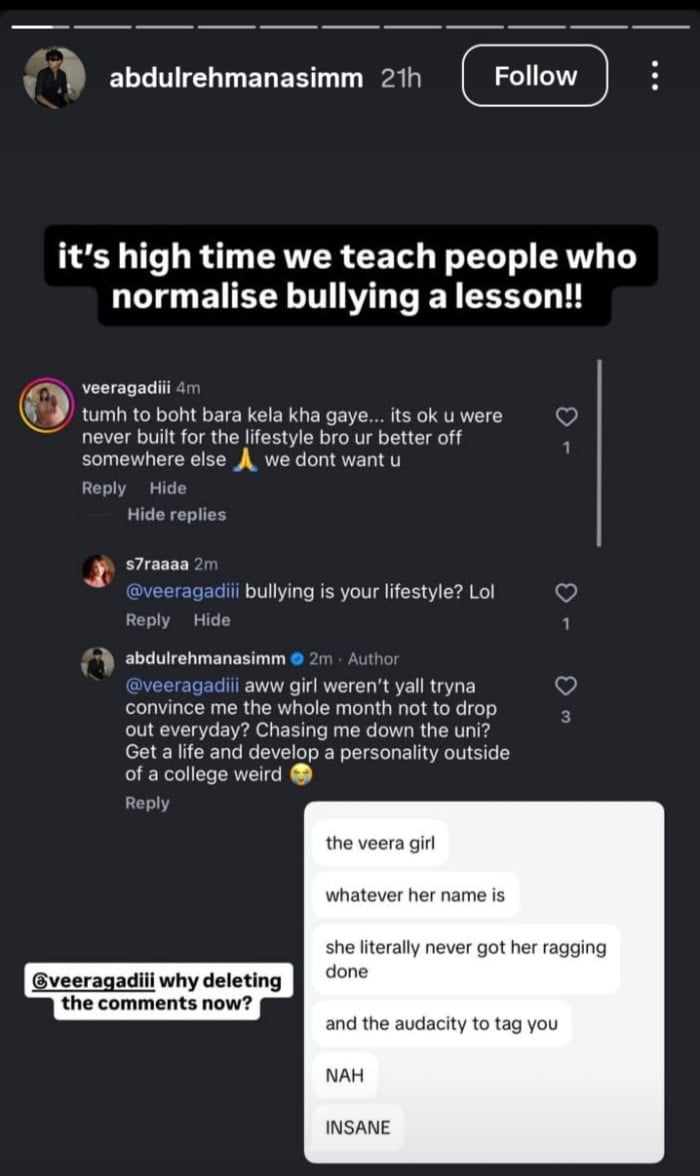 عبدالرحمان عاصم کی ویڈیو کے بعد سوشل میڈیا پر تعلیمی اداروں میں بُلنگ اور ریگنگ کے مسئلے پر ایک نئی بحث شروع ہو گئی ہے اور بہت سے لوگ اس معاملے پر کھل کر بات کرنے لگے ہیں۔
