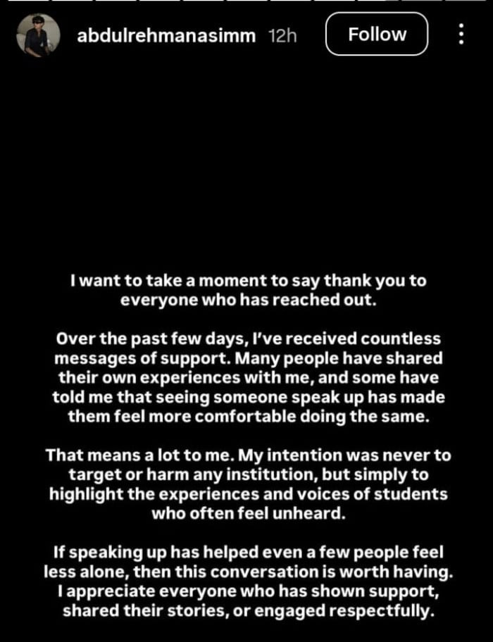 بعد ازاں عبدالرحمان عاصم نے ایک ویڈیو کے ذریعے کھل کر بتایا کہ انہیں مبینہ طور پر یونیورسٹی کے اندر بُلنگ کا سامنا کرنا پڑا، جو ان کے مطابق ادارے کے ماحول کا حصہ بن چکی ہے۔ ان کا کہنا تھا کہ اس تجربے نے انہیں ذہنی طور پر بہت متاثر کیا اور یہی وجہ ہے کہ انہوں نے ادارہ چھوڑنے کا فیصلہ کیا۔